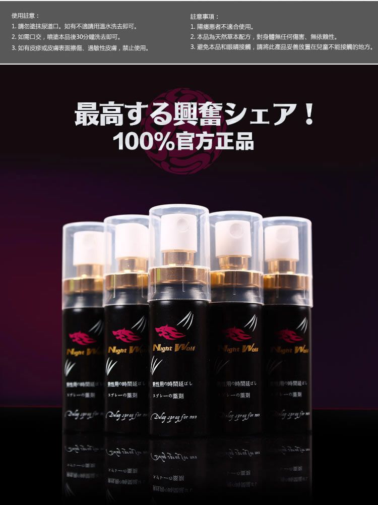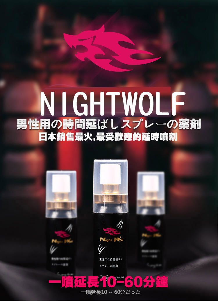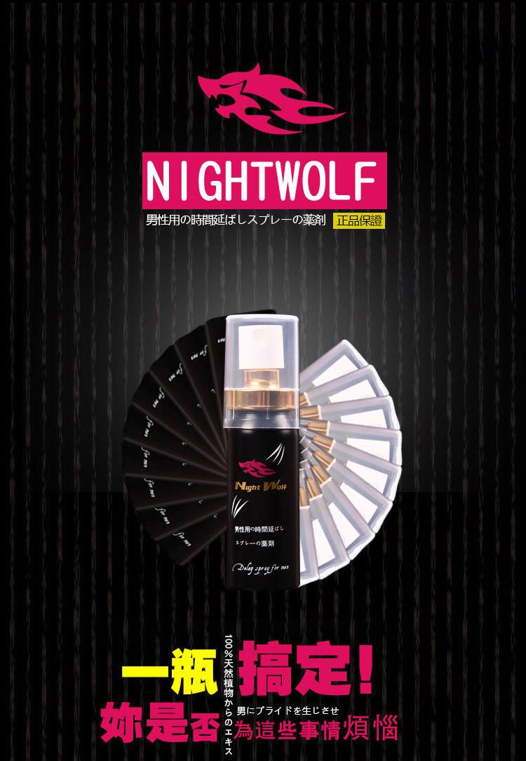 夜狼 NightWolf 男士延時噴劑,以東方男性肌膚特性為核心研發,採用多種植物精華精煉而成,溫和親膚、不刺激、不油膩、不麻木,讓你保持原有敏感度,同時擁有更專注、更持久的掌控力。夜狼,讓你更硬、更穩、更久