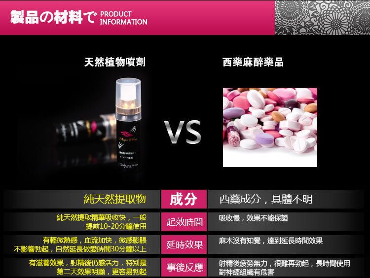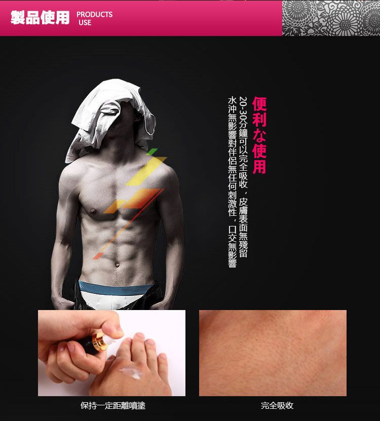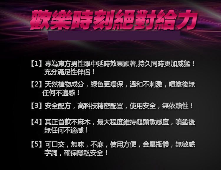 以天然植物萃取+高科技配方打造 快速延時、不麻木、超安全 的頂級外用噴劑