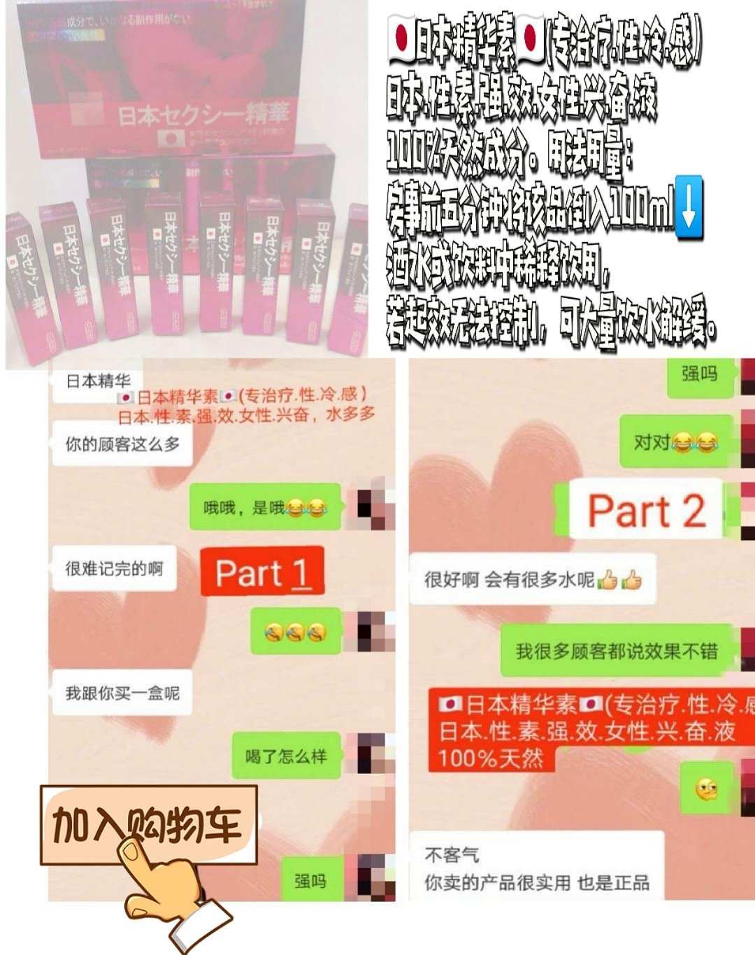 本品對女性性反應遲鈍、性冷淡、房事時陰道乾澀、鬆弛等症狀有顯著療效,是深受日本及東方國家女性喜愛的強效興奮口服液上品之先。本品顏色為無色無味液體,可迅速溶於各種飲料中而不被發覺,女士飲用本品數分鐘後,同時大腿內側酥麻,心跳加快,全身發熱,內陰發癢,下體分泌物增多,急不可待與您共渡愛河,此時的女性,熱情奔放,急需做愛,事後昏睡,無記憶。本品為純天然成分,無副作用,無依賴性,安全有效。