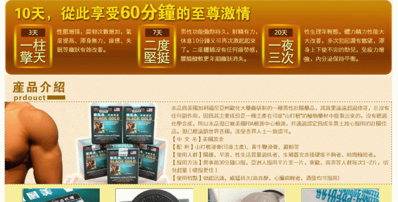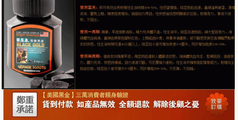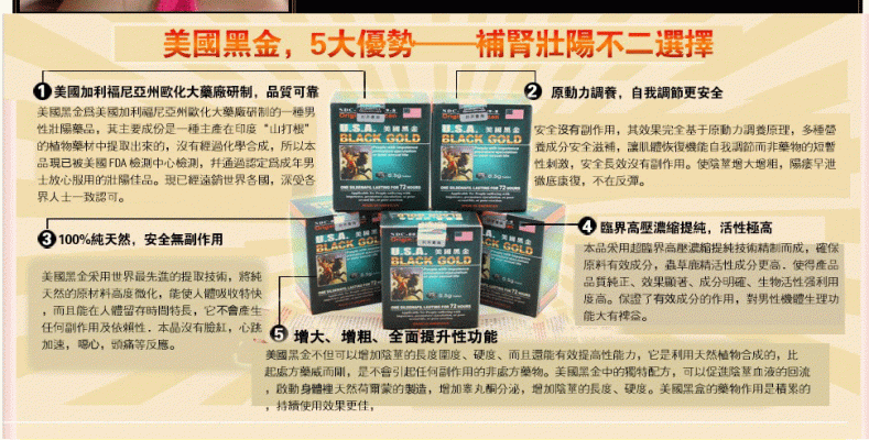 美國黑金由美國加利福尼亞州知名藥廠研製,採用高品質天然草本植物,經先進萃取技術精製而成,安全可靠,讓成年男性放心補給。